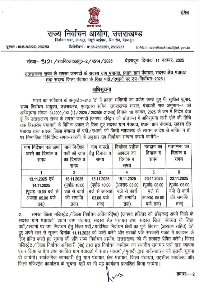 उत्तराखंड में पंचायत उपचुनाव के रिक्त पदों की अधिसूचना जारी